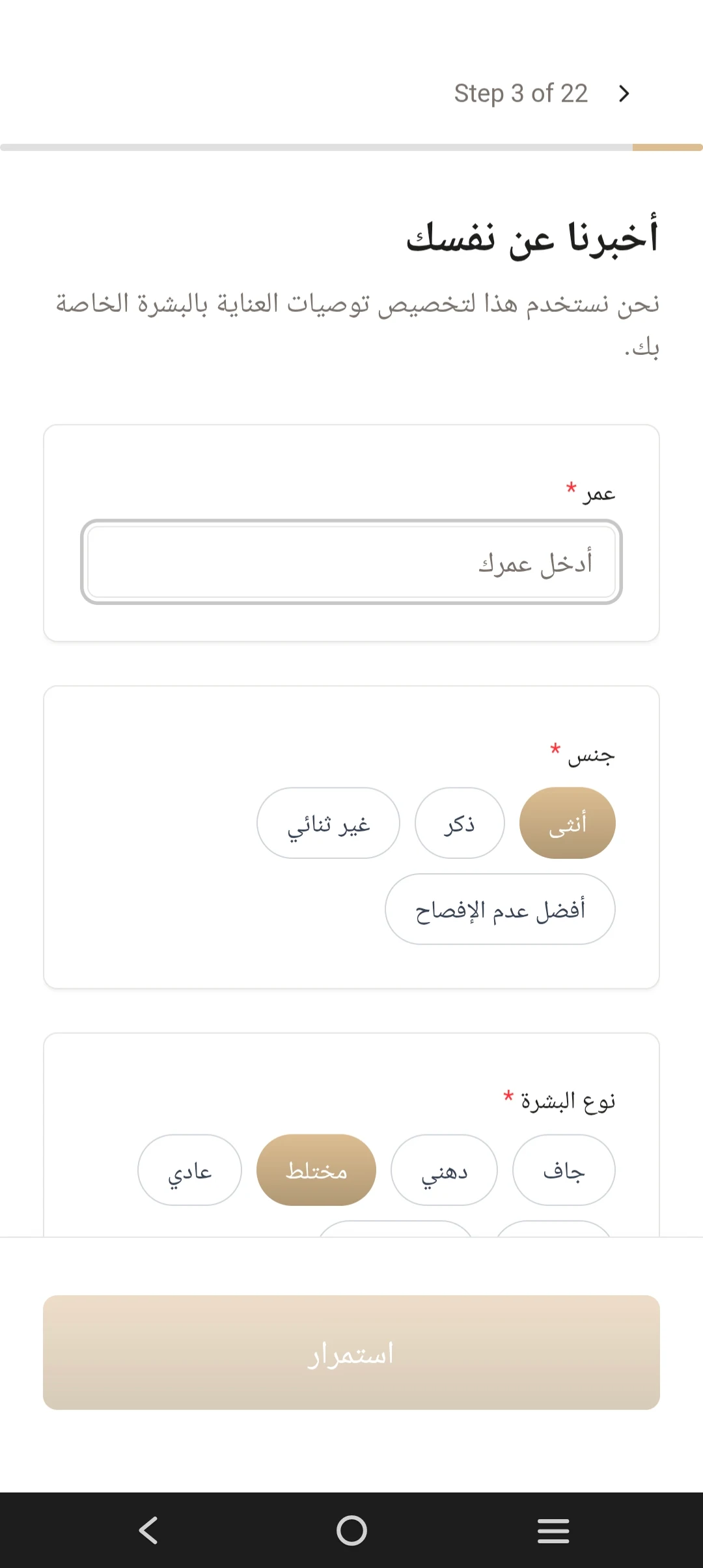 - نوع بشرتك محتاج رعاية خاصة (دهنية – جافة – مختلطة) وعايز توصيات مخصصة.