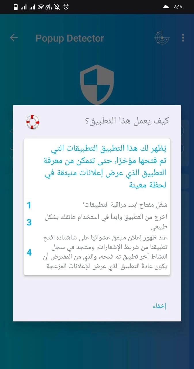 التطبيق يشتغل في الخلفية ويراقب أي ظهور مفاجئ للإعلانات. - تطبيق خفيف: