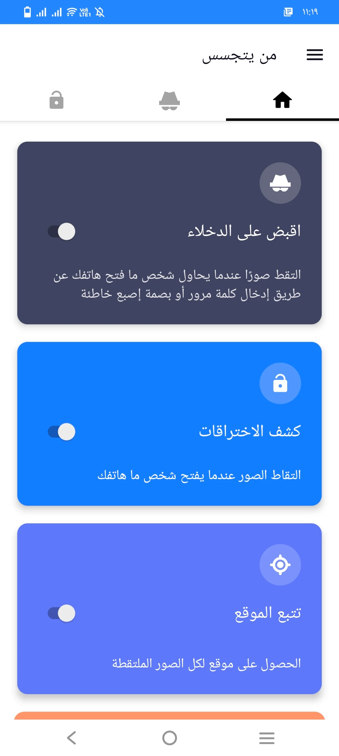 • نعم، عند محاولة فتح الهاتف بكلمة سر خاطئة أو تحريك الجهاز، التطبيق يلتقط صورة للمتطفل بصمت كامل.