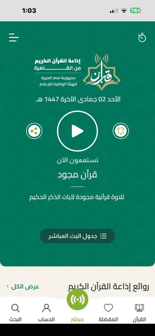 • 🔊 البث المباشر: استمع إلى إذاعة القرآن الكريم مباشرة من القاهرة بجودة صوت عالية.