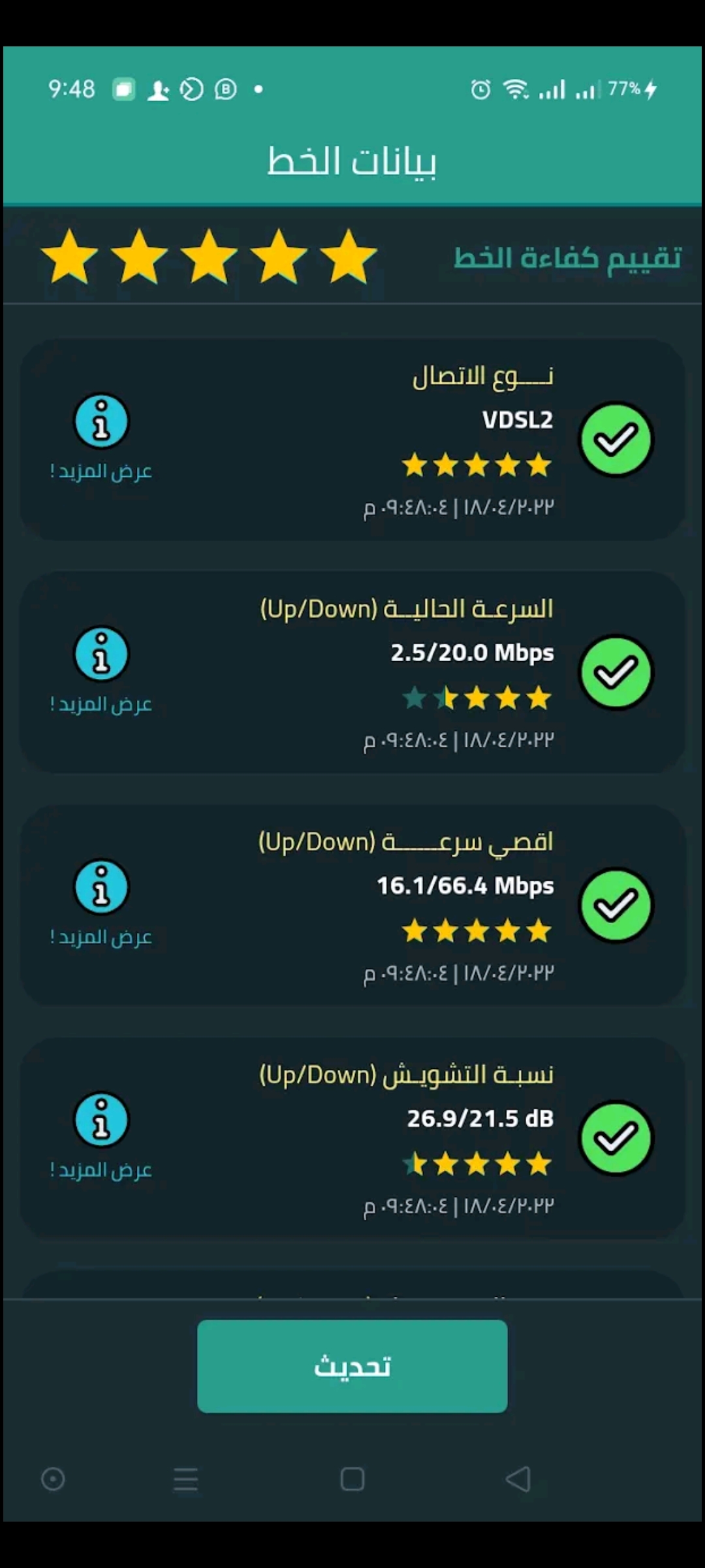 يمكنك من خلال التطبيق الاطلاع على بيانات دقيقة حول الشبكة الحالية: